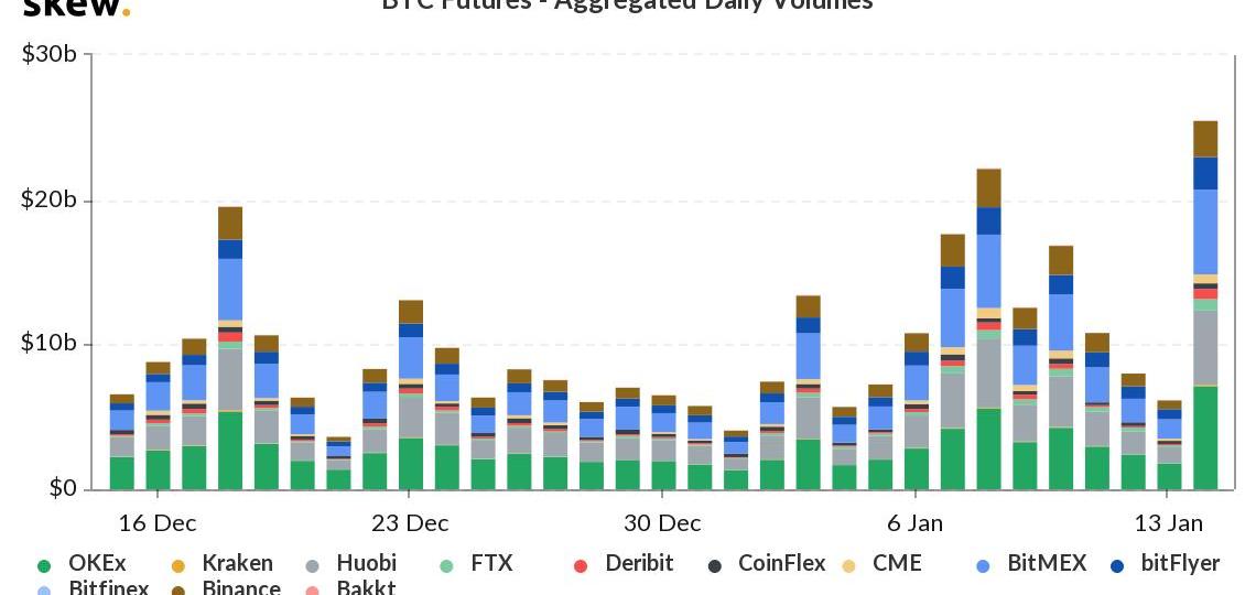 比特幣期貨合約單日交易量約為250億美元,也使得1月14日成為去年10月26日以來最繁忙的交易日。與此同時,比特幣期貨的未平倉合約增長了16%,達到35億美元,加密貨幣交易所OKEx、Bitfinex以及火幣上持倉量最高。