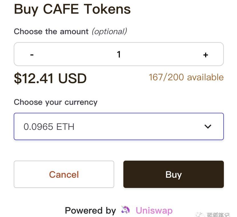 其次,通過Uniswap交易所,可以實現CAFE代幣的兌換,提前實現流通,也可以實現部分溢價。Uniswap是去中心化的交易所,在它上面不需要交易對手,它是資金池的模式,有自動做市商的機制,它可以激勵流動性的提供者提供流動性。只要存在價格利差,流動性提供商就會積極進來提供流動性。這是一種去中心化的流動性提供激勵機制。后續有機會藍狐筆記會專門剖析Uniswap的機制。