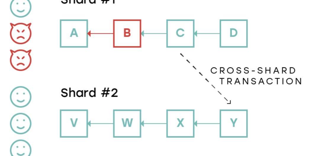 網絡安全性最直接的挑戰就是作惡成本降低,網絡分片中通過將網絡中的節點按照既定規則分配到不同的分片以達到擴容的目的,這會帶來一個問題:單個分片中的算力大小和驗證人節點數將遠小于原來的整個網絡,這將使得攻擊單個分片較攻擊整個網絡的成本大大降低
