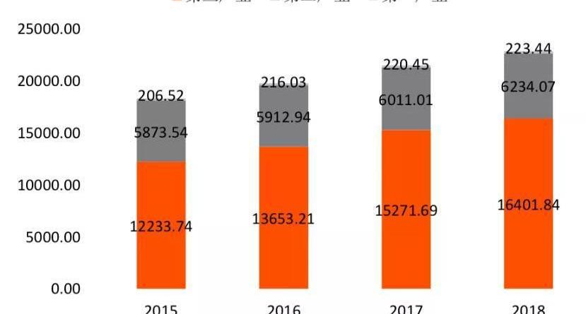 在經濟下行的大環境下,廣州市的經濟發展始終保持穩步增長的趨勢,2018年實現全地區地區生產總值22859.35億元,較上年增長6.3%。三大產業也均實現不同程度的增長,第一、第二以及第三產業的增長率分別為2.5%、5.4%、6.6%。