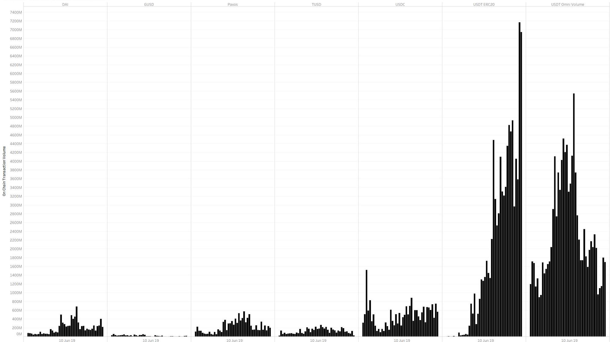 在早期階段,一條鏈可能有非常高的交易量,因為建立這條鏈的人需要發行資產,并將其轉移給合作伙伴。然而,如果普及沒有到來,每個地址的平均交易量將保持高位,這表明鯨魚控制了網絡。下圖是DAI與其他穩定幣交易量的對比。USDT在2019年處理了ERC-20和Omni之間兌換的2000萬筆交易。