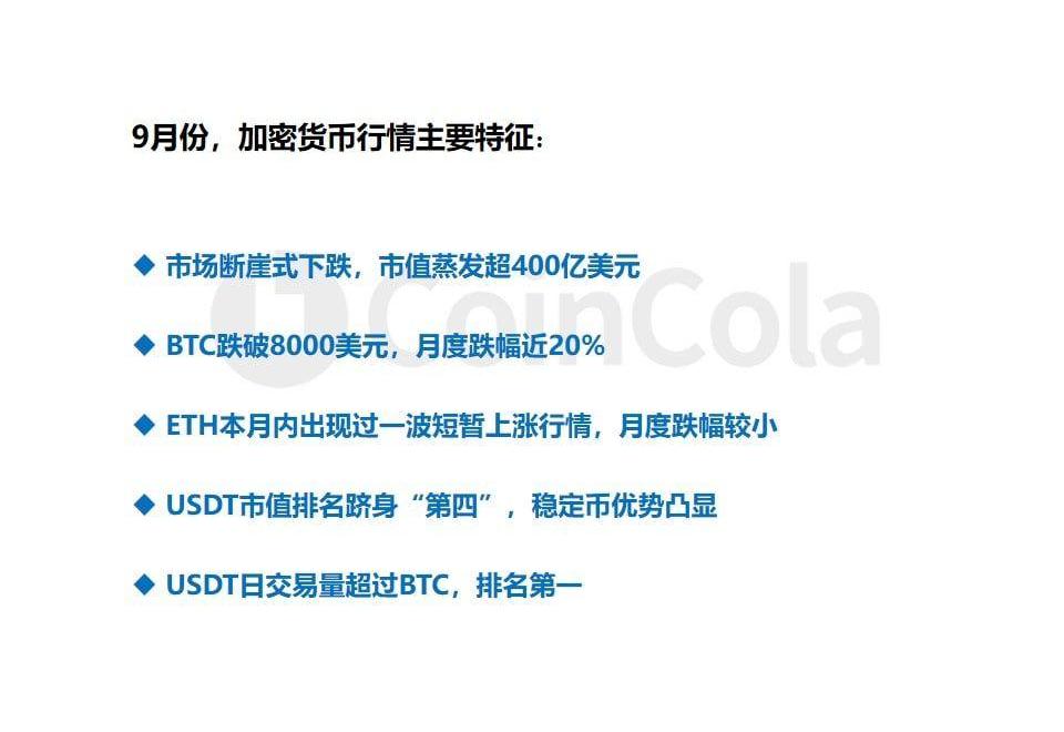 XRP/HKD+2.05%日前,可盈可樂研究院發布全球加密貨幣市場月報。報告顯示,在9月份,全球加密貨幣行情主要特征包括:市場斷崖式下跌,市值蒸發超過400億美元;BTC跌破8000美元,月度跌幅近20%;USDT市值排名躋身“第四”,日交易量超過BTC排名第一。