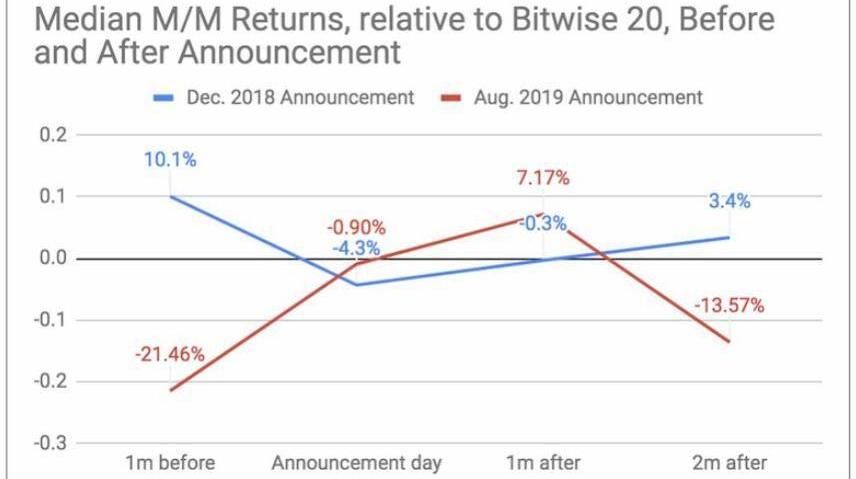 通過查看相關資產在公告前1個月至2個月后的月度表現(公告可能提前被泄露),并將其與Bitwise20指數進行對比。Bitwise20是由20個中等市值的數字資產組成的指數,包括ChainLink、ETC、Tezos、Zcash等。