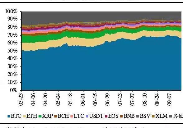 在市值排名前五位的BICS二級行業中,支付結算行業市值有所降低,從76.0%降至73.7%。從市值占比變化率看,性能優化行業市值占比增速較高,相比上周分別增長了30.0%;實物資產類市值占比下降較為明顯,較上周分別下降了19.0%。