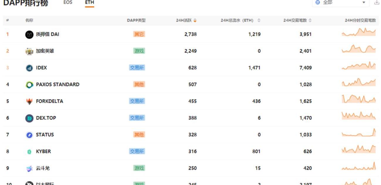 觀察Midu統計數據,24小時ETHDApp整體活躍程度有所增加。其中,質押借DAI的24小時總流水較昨日增減+7.46%,交易平臺IDEX的24小時總流水較昨日增減+1.29%;游戲加密英雄的24小時活躍用戶數較昨日增減+1.86%;穩定幣PaxosStandard的24小時交易筆數較昨日增減+3.21%。