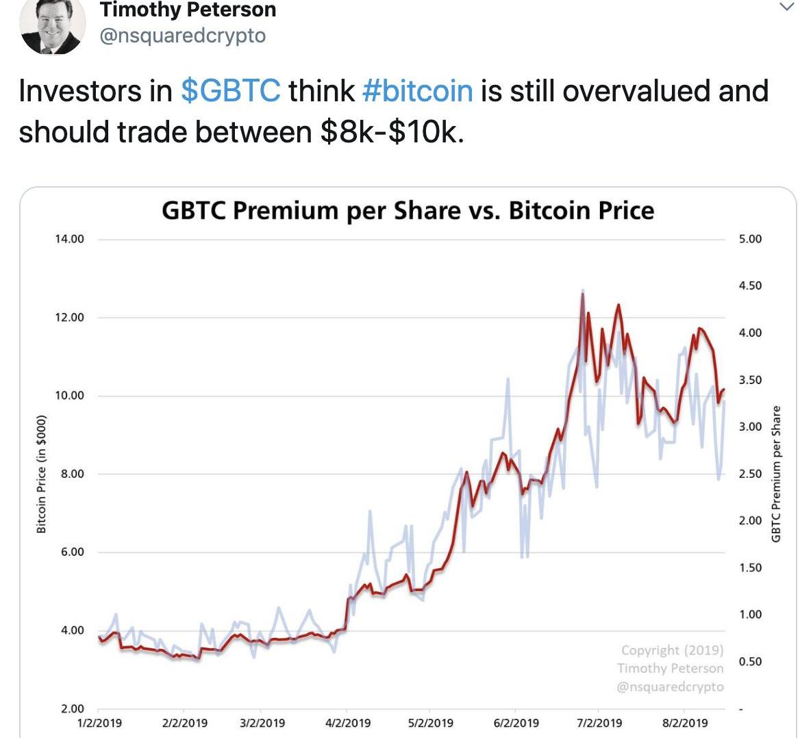 Grayscale的產品在場外交易市場上交易,但其價格往往高于BTC的實際價值。Peterson的模型預測顯示,自今年年初以來,GBTC對比特幣現貨的溢價越高,BTC的現貨價格就越高。根據他的分析,目前的溢價正在逐漸減少,比特幣目前“被高估,合理的價格應該在8,000美元到10,000美元之間”。