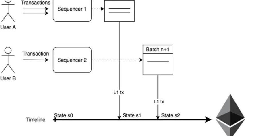 如下圖,用戶都可以自行選擇將交易發送給哪個Sequencer,甚至可以自己成為Sequencer,這些Sequencer在收到足夠的交易之后,會將這些交易打包成Batch,然后往L1上提交。
