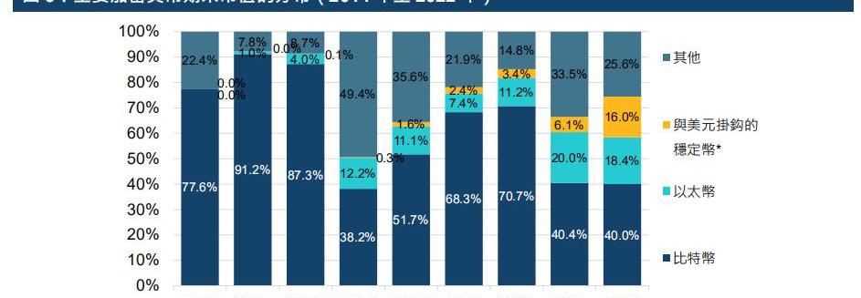 平均每日成交金額從2019年的318億美元增至2022年的1,361億美元;現貨的平均每日交易金額于同期從234億美元增長了105%至480億美元,相等于紐約交易所和納斯達克交易所上市股票同期的平均每日成交額總和的?21%左右;加密衍生品交易在2021年的交易額超過了現貨的交易額,2022年衍生品交易額幾乎是現貨的1倍。