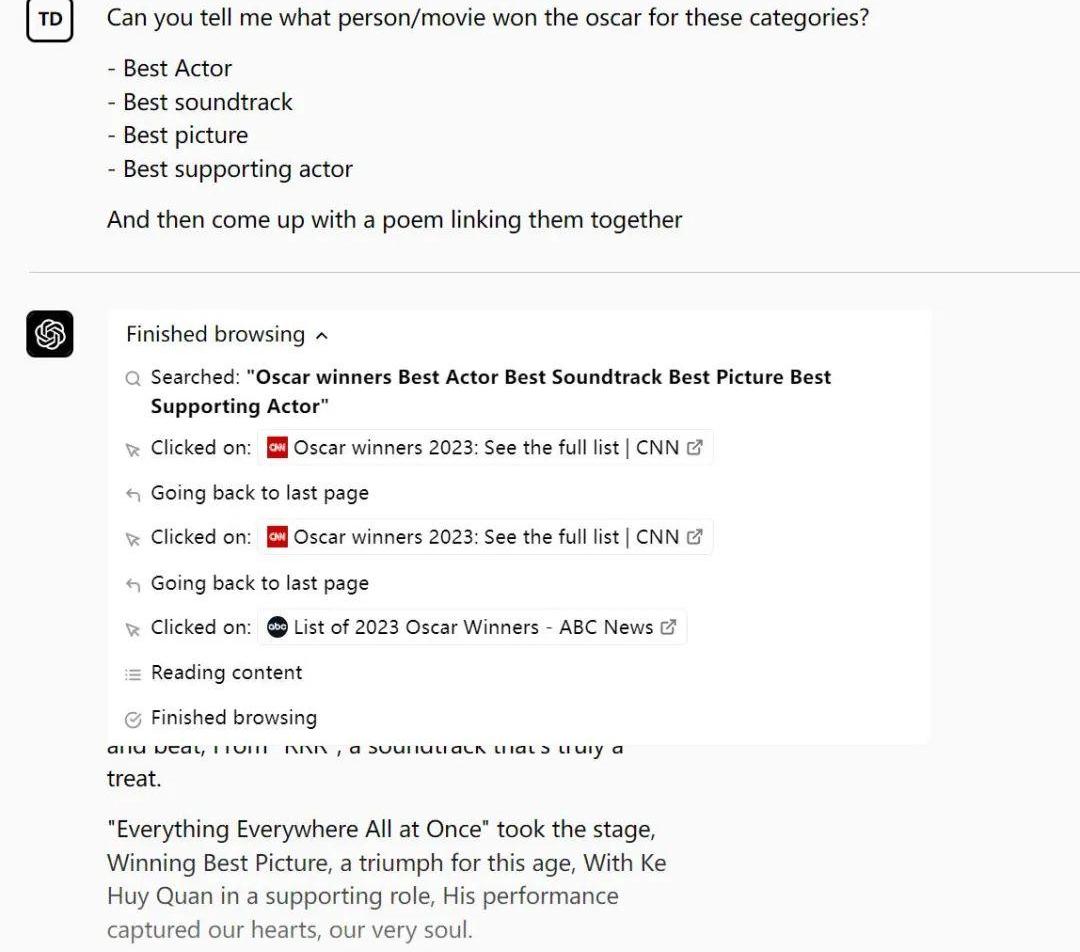 下圖是一個例子,可以看到的是,瀏覽為ChatGPT用戶打開了一種體驗,以前的模型可能會禮貌地指出它的訓練數據沒有包括足夠的信息讓它回答。而在這個例子中,ChatGPT檢索了最近的奧斯卡獎信息,然后進行了一番熟悉的ChatGPT詩歌表演。瀏覽成為了一種附加體驗的方式。