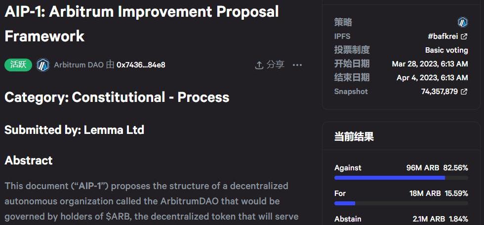 XRP/HKD+1.75%就在ARB代幣空投幾天后,3月28日,Arbitrum社區在Snapshot上發起ArbitrumImprovementProposal1(AIP-1)提案投票,擬引入一個名為ArbitrumDAO的去中心化自治組織結構,該組織由ARB持有者管理,位于開曼群島的Arbitrum基金會將為ArbitrumDAO社區服務并受其管理,旨在促進Arbitrum生態系統的成長和發展。