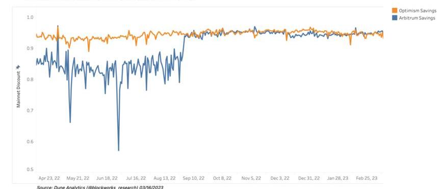 此外,Optimism計劃在不久的將來發布自己的升級版。Bedrock與Nitro類似,將提高Optimism的呼叫數據壓縮效率,并應產生類似的交易成本節約。雖然Optimism和Arbitrum的費用在整個2023年第一季度保持相對平等,但預計這種競爭格局將無限期地持續下去,參與者越來越多。