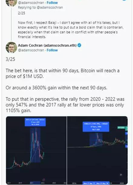 Cochran表示,Balaji的賭注是在加密市場進入寒冬之后,去年加密寒冬來臨,當時價格暴跌,許多加密公司倒閉,之后該行業發展舉步維艱,加密行業內的很多人失去了對未來的希望,所以人們“渴望行情好轉”。他表示:“看到加密行業在如此危險的宏觀環境中被不切實際的賭注所推動,很令人失望。”