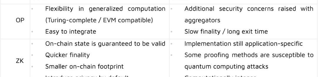 比較這兩種類型的rollup,OP相對ZK的主要優勢在于它的廣義計算非常靈活。OPRollup上的虛擬機只需要支持欺詐證明的生成,而ZKRollup上的VM將需要支持ZKP的生成。這使得遷移到optimisticL2對于開發人員來說非常容易。在以太坊上,這意味著開發人員可以像在L1上一樣,簡單地用Solidity編寫代碼。ZK-EVM正在進行開發,但現在沒有單個方案能夠提供與EVM兼容的實現。此外,ZKP生成目前需要相當大的計算量,這意味著它們將無法像OPRollups那樣以全速處理許多交易。根據Vitalik最近發布的一篇文章,ZK-EVM的性能和兼容性成反比例關系,這意味著ZK-EVM與本機以太坊環境越兼容,效率就越低。這是因為EVM并不是以與ZK友好為目標開發的,導致許多操作難以進行ZK證明。