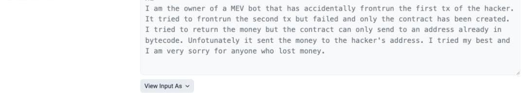 2023-03-1312:08:35UTC,攻擊者EOA地址1發起鏈上喊話交易,喊話內容為:攻擊者EOA地址1自稱為MEV機器人,搶跑了攻擊者EOA地址2的第一筆攻擊交易,嘗試搶跑其他的攻擊交易但失敗。更不幸的是,它創建的攻擊合約只能提款到攻擊者EOA地址2的獲利地址。