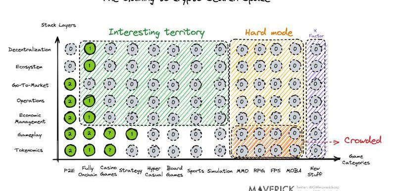 橫向:有許多游戲類型,每個類型都有自己的領域專業知識、目標受眾、游戲玩法和游戲內動態。垂直:一個成功和盈利的游戲產品需要大多數層次結合在一起:代幣經濟、游戲玩法、GTM、運營、經濟管理、生態系統和去中心化等等。一個薄弱的層次可能很容易摧毀整個體驗。由于加密貨幣+游戲是如此新穎,還沒有針對任何單一層的嘗試和驗證設計。找到單個單元的最優解已經很難了。找到能夠共同工作的垂直線則更是難了幾個數量級。我們相信,在找到全棧解決方案之前,我們將看到更多的迭代、實驗和試錯。單元格:每個單元格中的數字表示加密空間已經看到的相對成功的嘗試次數。即使最終失敗,每個成功的游戲都將推動加密的集體專業知識向前發展,并使我們更接近最終解決一個或兩個單元格。迄今為止,最知名的迭代發生在P2E、完全基于鏈上、賭場游戲和策略游戲。集體探索:加密游戲領域的建設者們建立和迭代他們的產品,以便我們擁有更多更高數字的綠點。隨著我們積累集體專業知識、才華、經驗、最佳實踐和案例研究,我們在概率上越來越接近創造正確的加密游戲。
