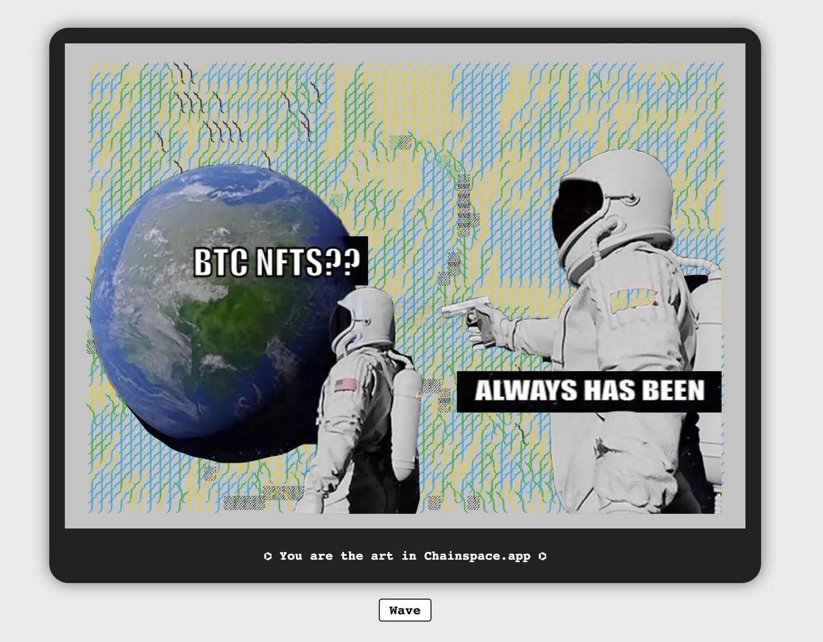 Chainspace是一個基于比特幣網絡協議Ordinals的NFT項目,包括800個存儲在比特幣網絡中的視頻渲染應用,你可以用它來自拍,使用預設的、代表不同加密社區美學風格的濾鏡,生成自拍版的gm表情符號,進行身份表達和社區互動。