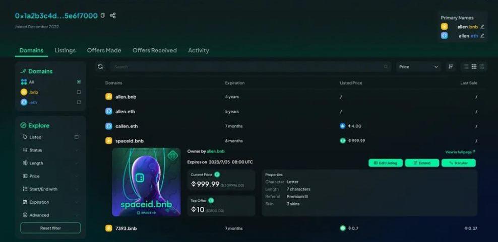 然而,無論用戶擁有哪些Web3域名,搜索、注冊和管理不同的域名都是一件讓人頭疼的事情,而現有的NFT市場卻并不適用于交易域名NFT——就像ENS用戶必須在ENS應用上設置他們的主要域名或控制器,而「.bnb」所有者則需要在BNBChain上的NFT市場來列出他們想要出售的「.bnb」域名......