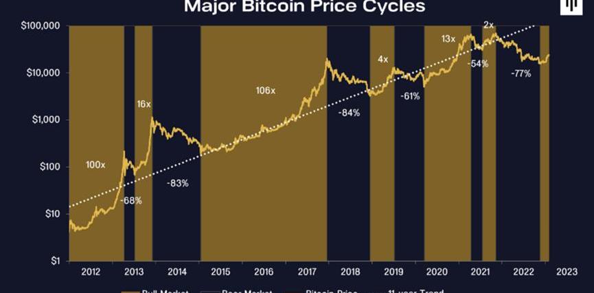 從長期來看,在過去12年中,比特幣價格一直處于每年平均2.3倍的長期上升趨勢。