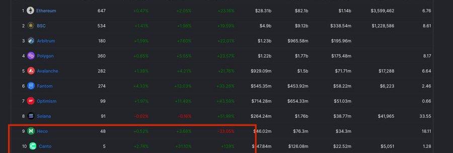 根據DeFiLlama,自新年以來,Canto鏈總TVL一直呈現快速增長趨勢,近7日增長20.36%,近一月增長93.53%。其TVL已從年初的6600萬美元增長至目前的1.36億美元。若去除Polygon、Arbitrum、Optimism三個Layer2項目,目前是24h交易量第七大Layer1。