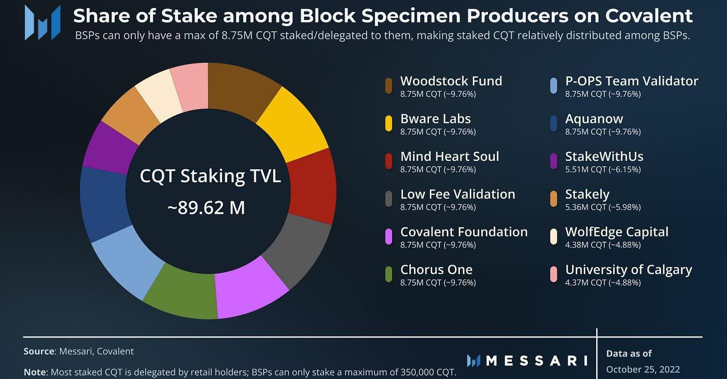 Covalent的去中心化協議將有多個網絡參與者,稱為"運營商"。目前,只有一個網絡運營商的角色是運行著的,那就是區塊樣本生產者。截至2022年10月,Covalent有?12個BSP,其中較著名的有ChorusOne、Woodstock、StakeWithUs和卡爾加里大學。然而,隨著Covalent繼續去中心化,這個角色仍然是許可的。