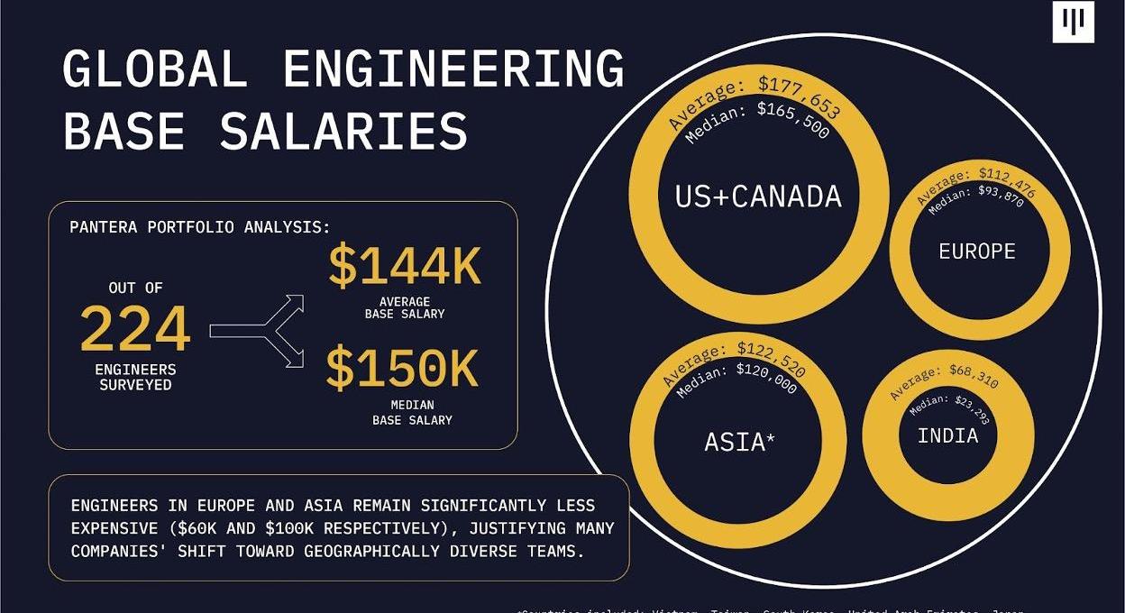 全球加密行業工程師年平均工資為144,892美元,中位數為150,000美元。美國和加拿大的加密工程師的年平均工資為177,653美元,一位杰出的高級工程師年薪可以達到346,500美元。