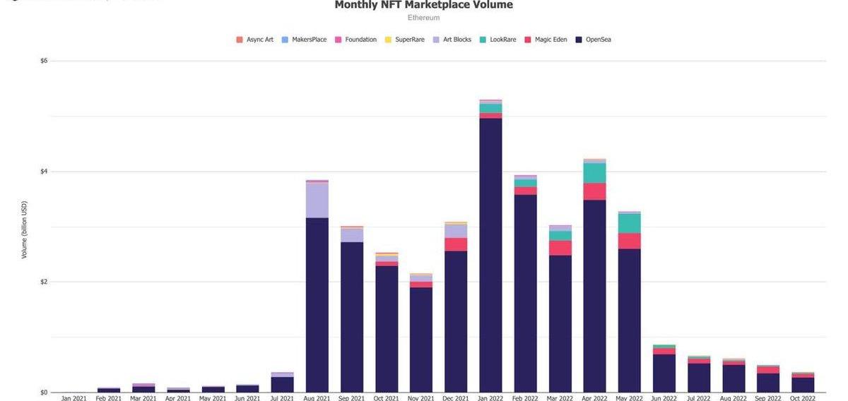 10月以太坊NFT市場交易量進一步下降25.1%,至3.775億美元。*LooksRare的交易量自1月以來已重新調整,去除了清洗交易量: