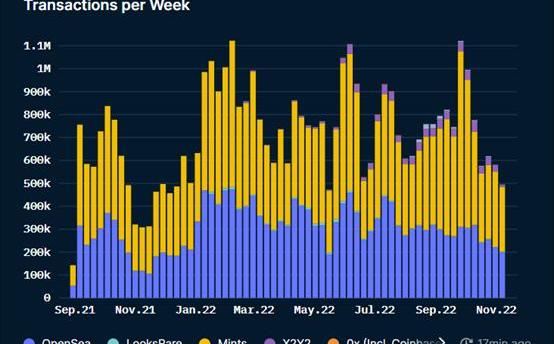 NFT總市值持續下降中,本周頭部藍籌NFT項目地板價均出現一定幅度下降,其中以CloneX下降13%,Otherdeedofotherside下降14%,下降幅度最大,另外每周交易量已連續三個月維持在70000個ETH附近,但從每周交易筆數上看,連續5周均出現持續降低;交易NFT的老用戶自9月中旬開始持續降低,逐漸離場,首次購買NFT的用戶開始出現小幅增長,目前單日地址基本達到1萬附近。