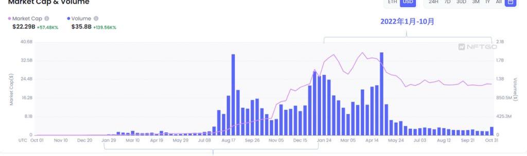 2021年NFTBoom至今,全球NFT市場逐步擴張,盡管當前宏觀經濟前景黯淡,整體加密貨幣市場受多重因素影響而遇冷,但NFT市場規模仍在曲折中緩慢增長。目前以太坊上NFT市場規模大約為223億美金左右,相比于2021年初的6200萬美金不到,在近2年時間內已經實現了360倍的增長。2022年初至今,以太坊NFT交易量大約為210億美金左右,盡管正值加密貨幣熊市,相比于2021年全年153億美金交易量仍有37%的增長。