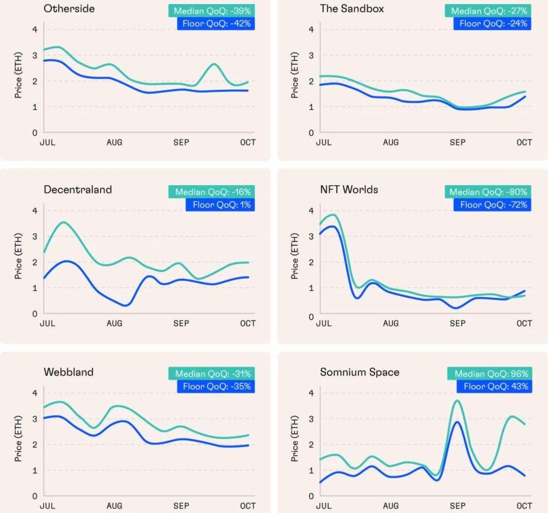隨著全球經濟衰退的逼近,加密貨幣市場進入了寒冬模式。上個季度,我們注意到各資產類別的價格急劇下降。盡管全球市場在夏季短暫反彈,但虛擬土地的價格目前正穩定的下跌。