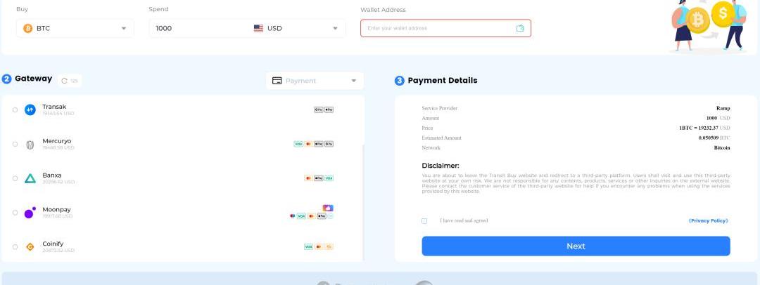 對于終端用戶,獨立出入金項目有更簡潔易上手的交互界面。獨立出入金項目不像中心化交易所一樣在用戶注冊時直接要求驗證并在登入后提供上百個交易對,而是在極簡的交互頁面上直接標注法幣數額和對應的加密幣數額。雖然用戶在交易超過幾百美金或者提款時依舊需要身份驗證,獨立出入金項目對第一次購買加密幣的散戶非常友好。大多數獨立出入金項目只支持自托管錢包,因此省去了從托管錢包轉移加密資產的步驟,隱私性也更好。大多數獨立出入金項目允許合作分銷商用SDK設置分銷加成,因此分銷商可以自由控制利潤,而中心化交易所的分潤不會如此明確。