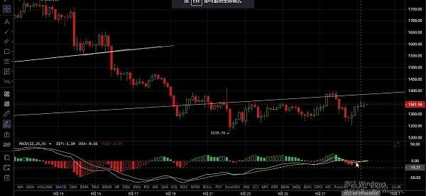 以太坊昨日打到1250支撐區域迅速反彈,晚間一路上行至1355一線承壓回落,空單小幅獲利,目前在一小時來看布林帶縮口三線走平,macd多頭減弱空頭增強雙線有死叉跡象,幣價上行力度減弱布林帶有向下開口跡象,高位空單可持倉下看,四小時級別行情在布林帶中上軌運行,反彈高點逐步降低,幅圖指標沒有明顯信號雙線粘合,布林帶縮口行情反復,距離收月線還有兩天注意風控,日內思路建議高空低多,1365-1390空,目標1330-1310-1280,1315-1285多,目標1340-1360