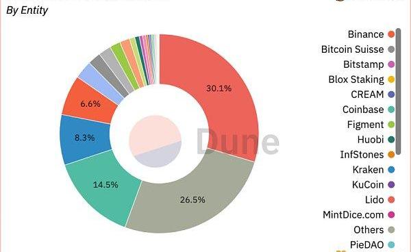 目前市場上ETH的流動性質押占33%的份額,其中?30%的份額為Lido,30.8%在CEX,26.4%為Others。