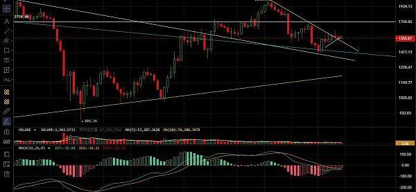 以太坊活動區間逐漸變窄,昨日上下僅30點空間波動,行情插針至趨勢線壓制轉為的支撐線上,且多次試探都未跌破,目前幣價在1550附近震蕩,四小時級別可以看出受中軌壓制在行情在中下軌運行,macd呈空頭雙線死叉狀態,kdj三線粘合,短期行情波動較小多空焦灼,日線級別k線連陰,反彈逐步降低,盤面看著偏向空頭,關注上方1575附近不破可空,穩健可等方向出來再操作,上方壓力1570-1600,下方支撐1530-1500