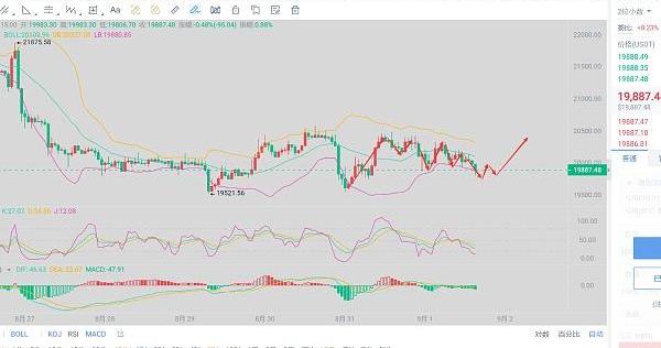 比特幣今日行情還是偏向震蕩,目前行情還是在20000附近徘徊,1小時級別來看幣價不斷下探布林帶下軌并沒有得到有效跌破,短期下軌可以作為一個有效支撐,DKJ三線向下發散,MACD空頭能量開始放量,4小時來看幣價刺透下軌,下行通道并沒有打開,那么我們的思路回踩去接多即可。