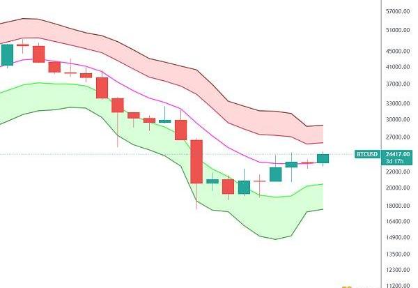 BTC多次向上試探后開始突破,短期支撐23700-23800,站穩不破后續有望繼續上攻,短期壓力25000-25100,一旦突破后續壓力26000上方,周線重新站上中軌,前期高位跌破單邊下跌行情啟動,目前重新站上,后續反彈有望延續。