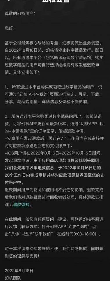 XRP/HKD+1.14%今日,數藏平臺幻核發布公告,宣布正式停止數字藏品發行,進行全面清退,給出的原因是基于核心戰略考量做出的業務調整。這一消息無疑給數藏行業扔下了一顆重磅炸彈,引起業內巨大震動。